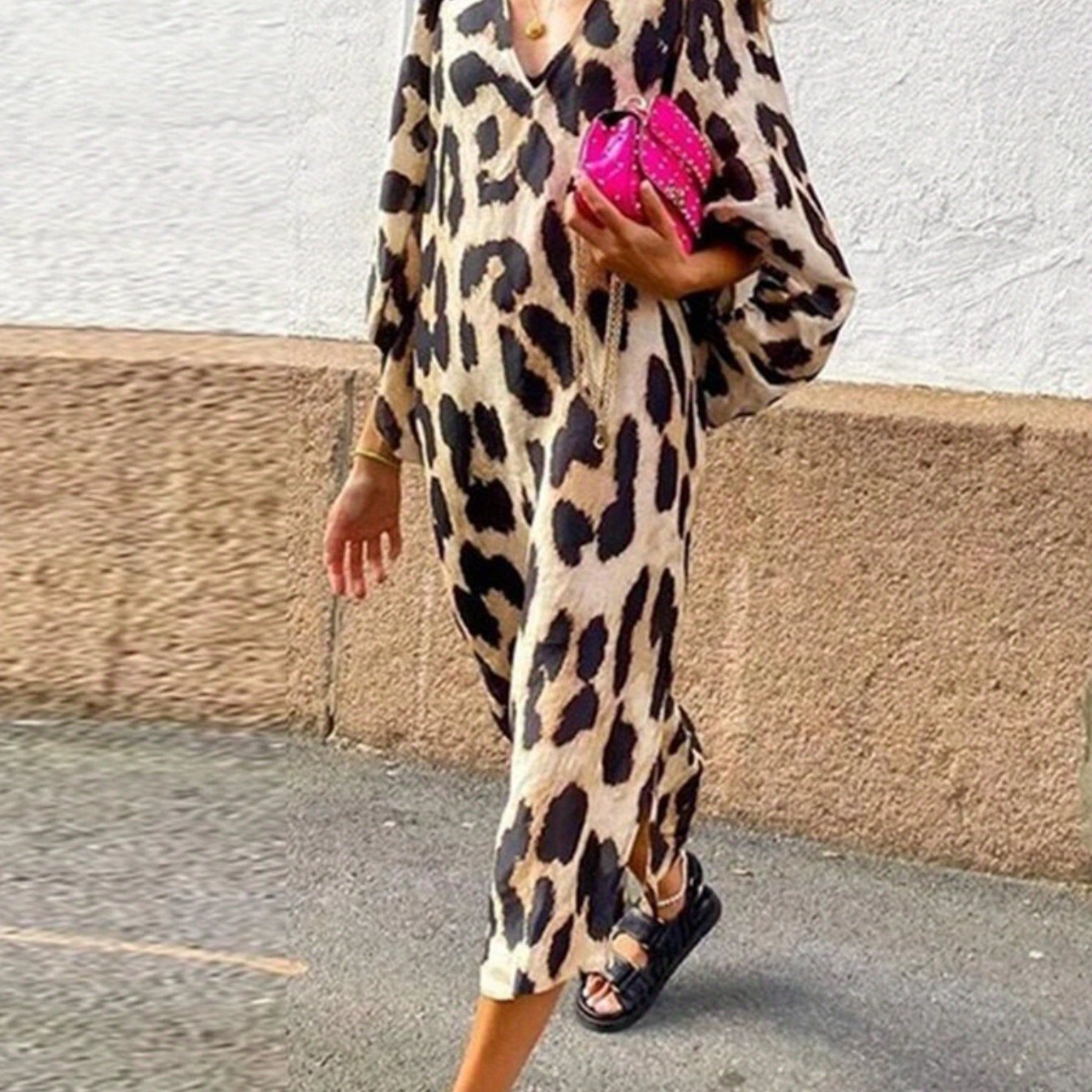 Make a bold statement with this V-neck Leopard Print Long Dress, designed for the modern woman who values both confidence and comfort. Featuring a loose silhouette, breezy lantern sleeves, and a subtle side slit, this dress offers the perfect blend of casual elegance and effortless flair.