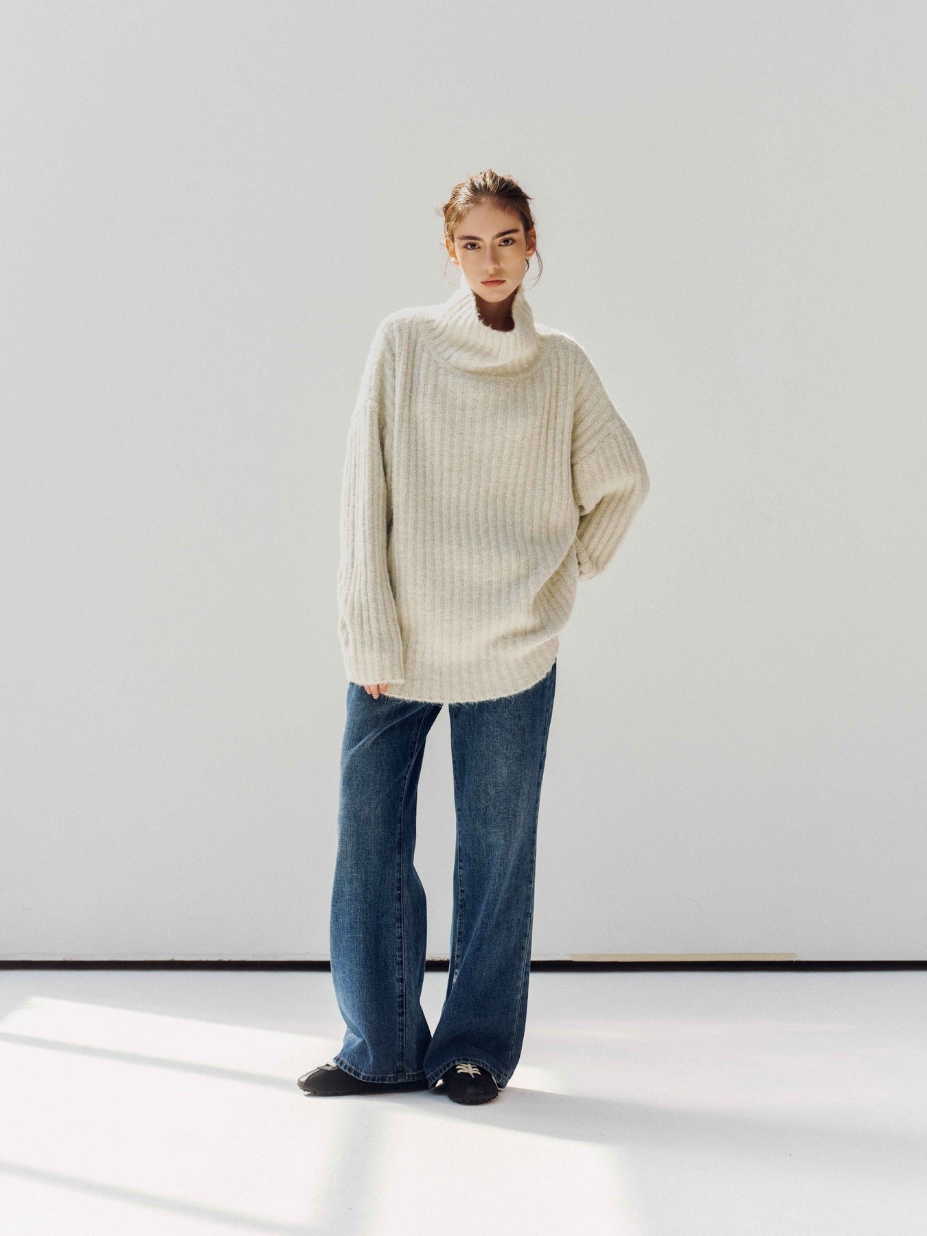 A cozy ribbed knit sweater crafted from a soft wool-blend with recycled fibers. Designed with a relaxed fit, dropped shoulders, and a high turtleneck for added warmth. The fluffy texture and ribbed structure make it perfect for layering in colder seasons.