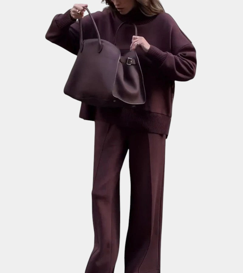 Crafted from luxuriously soft, premium fabric, this set moves with your body while keeping you warm and comfortable. The turtleneck sweater with a sleek side zipper adds a modern, flattering edge, while the wide-leg pants provide graceful flow and freedom of movement.